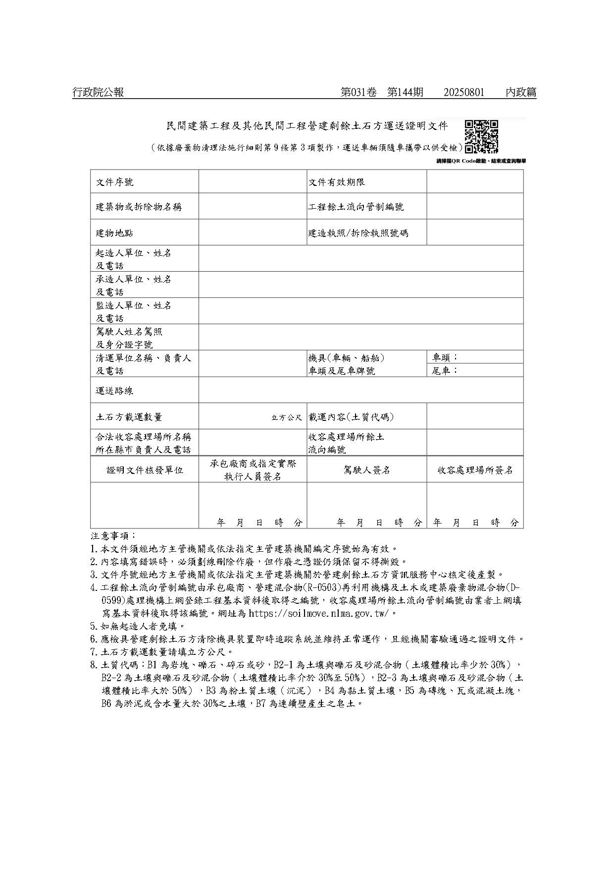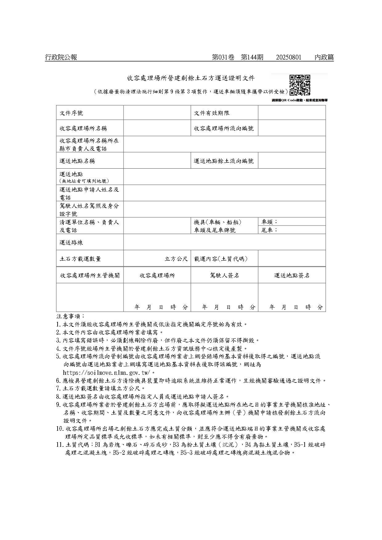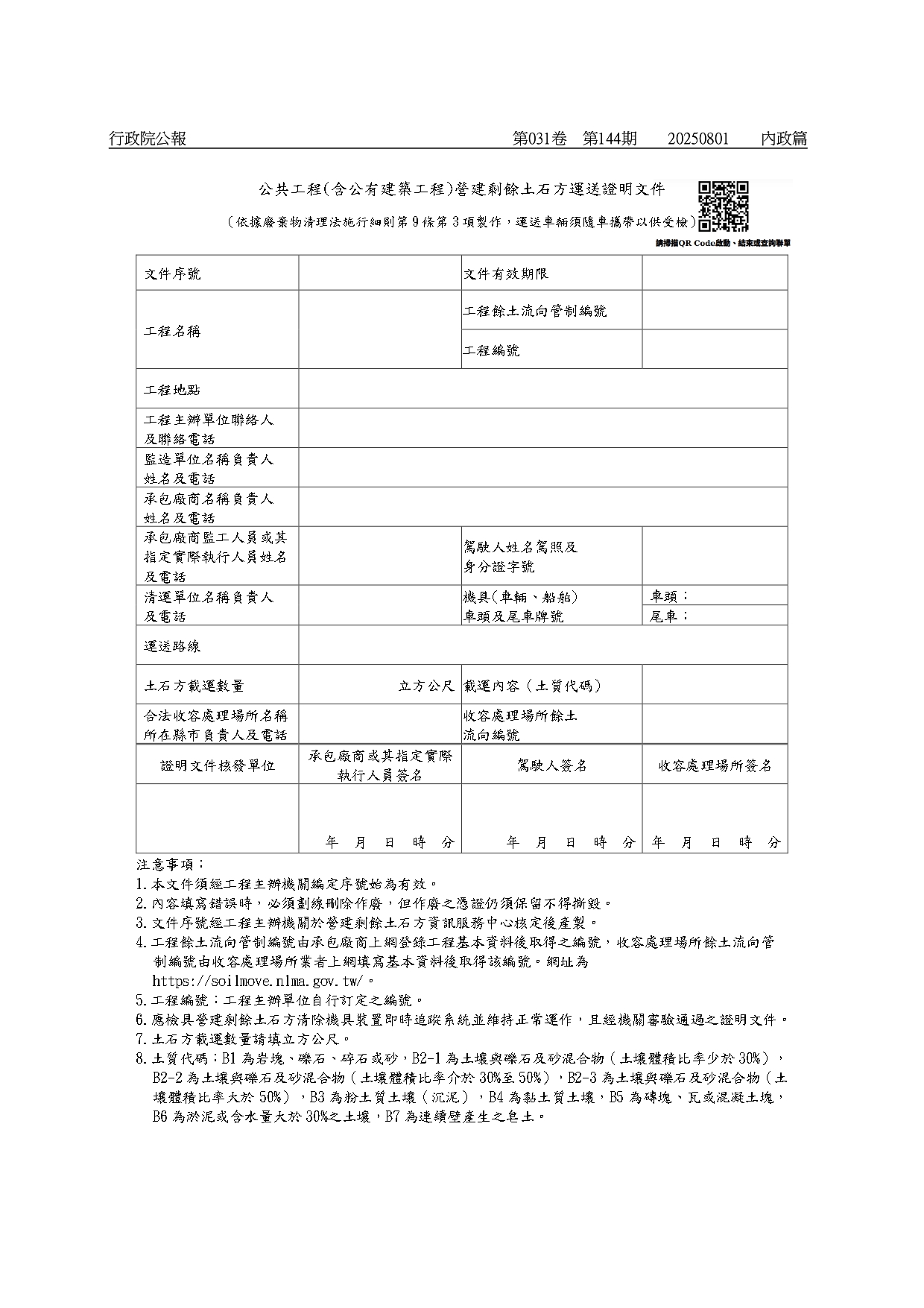 有關「民間建築工程及其他民間工程營建剩餘土石方運送證明文件」、「公共工程(含公有建築工程)營建剩餘土石方運送證明文件」、「收容處理場所營建剩餘土石方運送證明文件」,業經內政部於114年8月1日以台內國字第1140809466號令訂定發布,如需訂定發布規定,請至行政院公報資訊網(網址:https://gazette.nat.gov.tw/egFront)下載