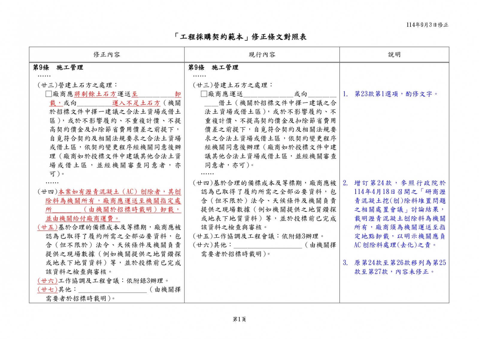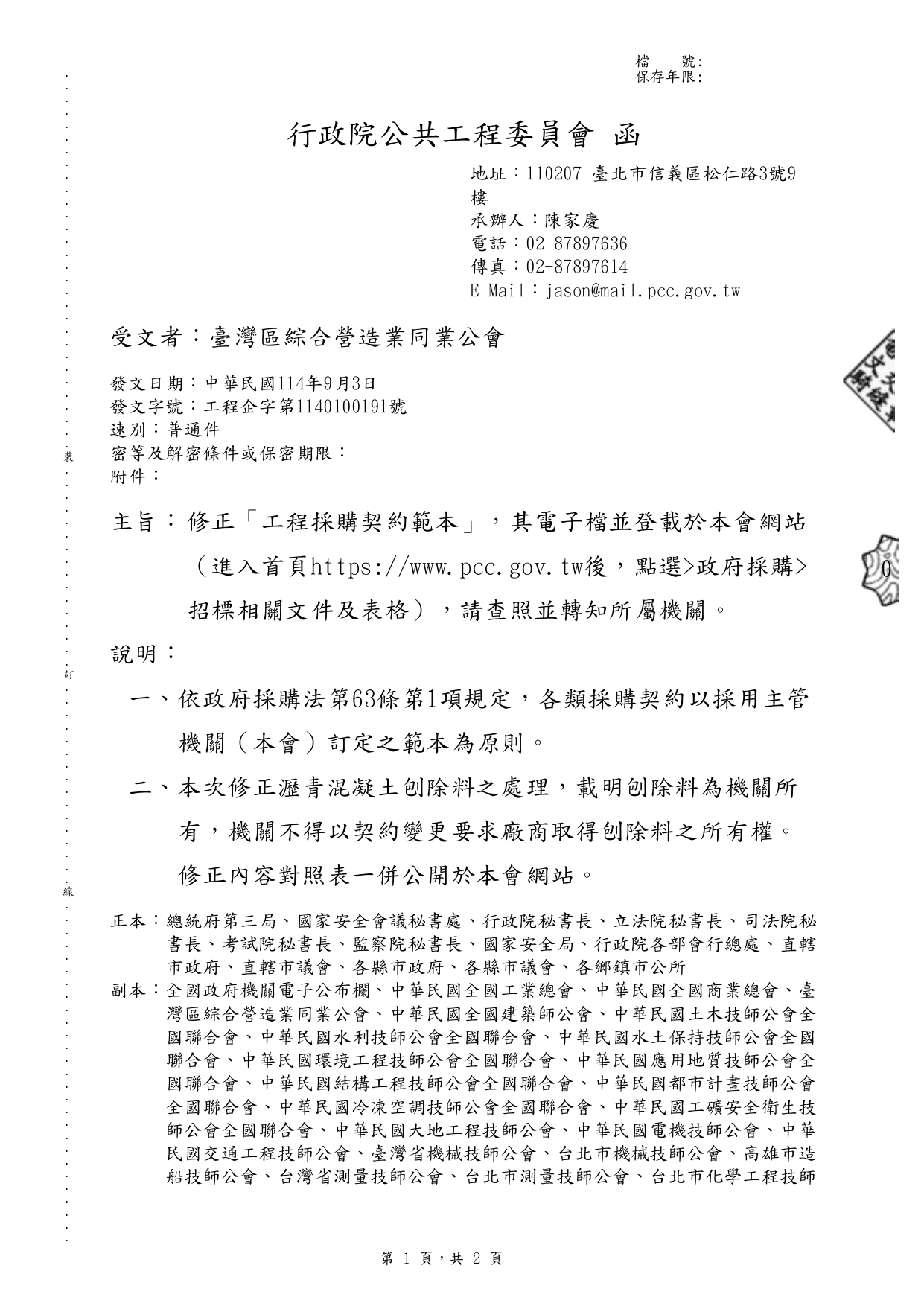 行政院公共工程委員會 114.9.3 工程企字第1140100191號函