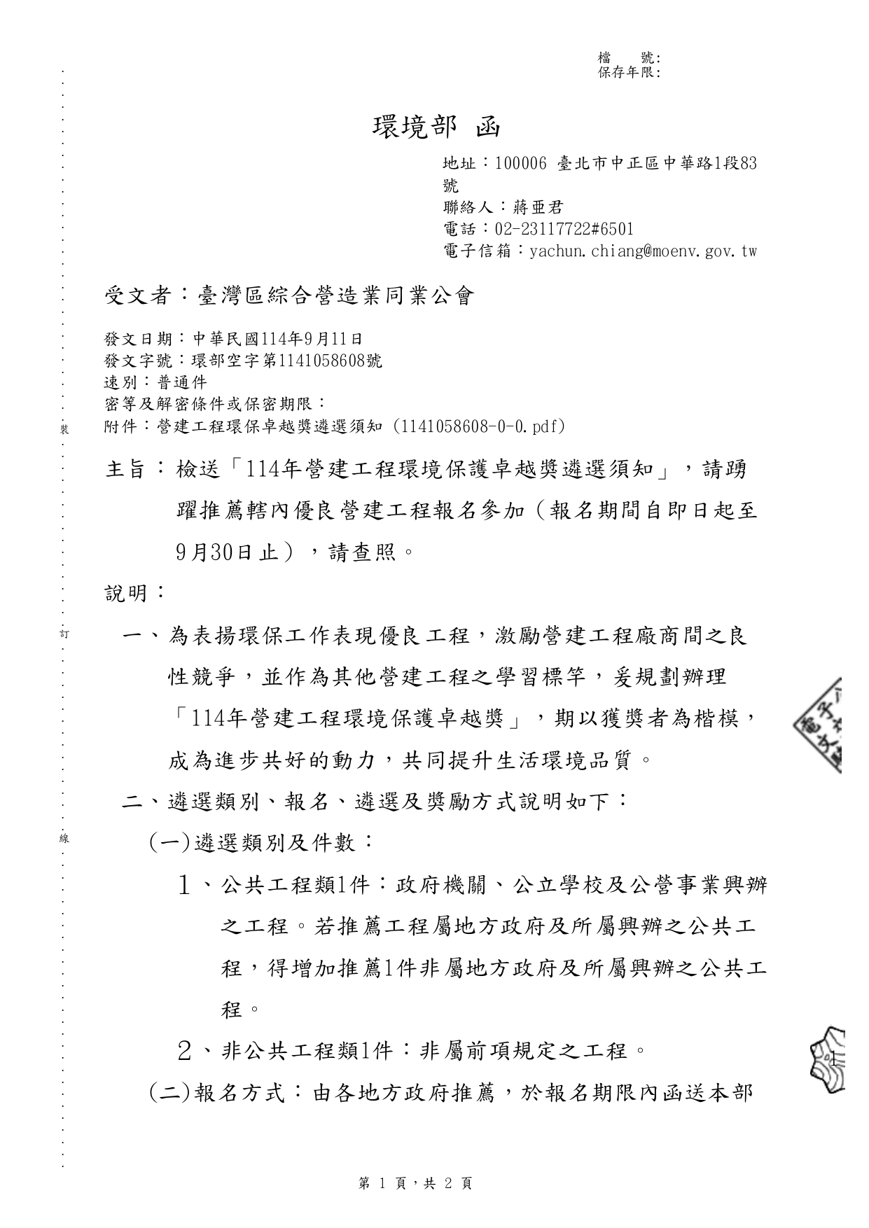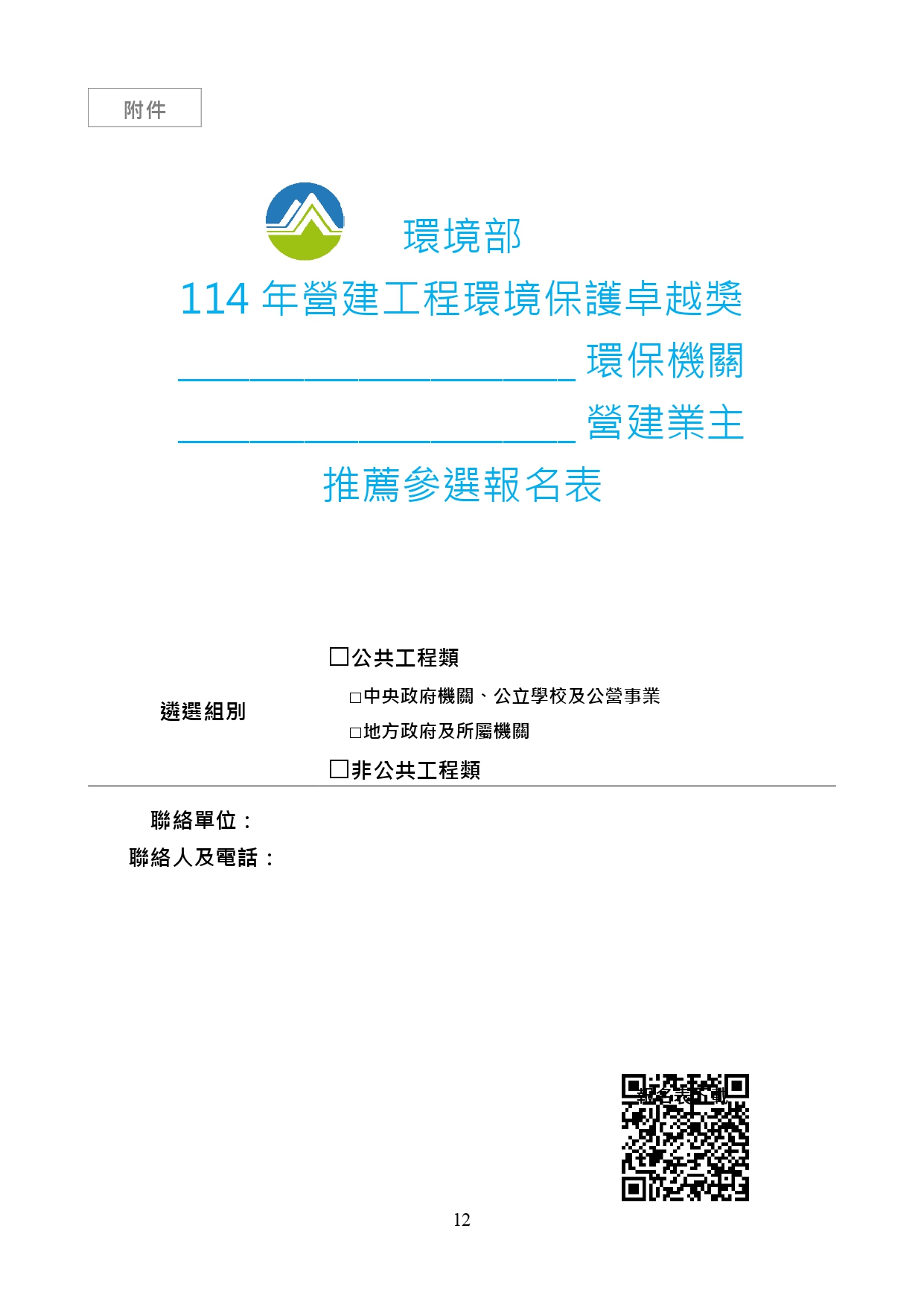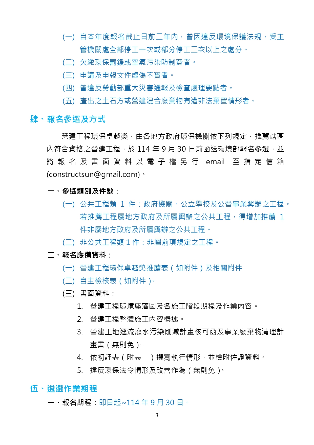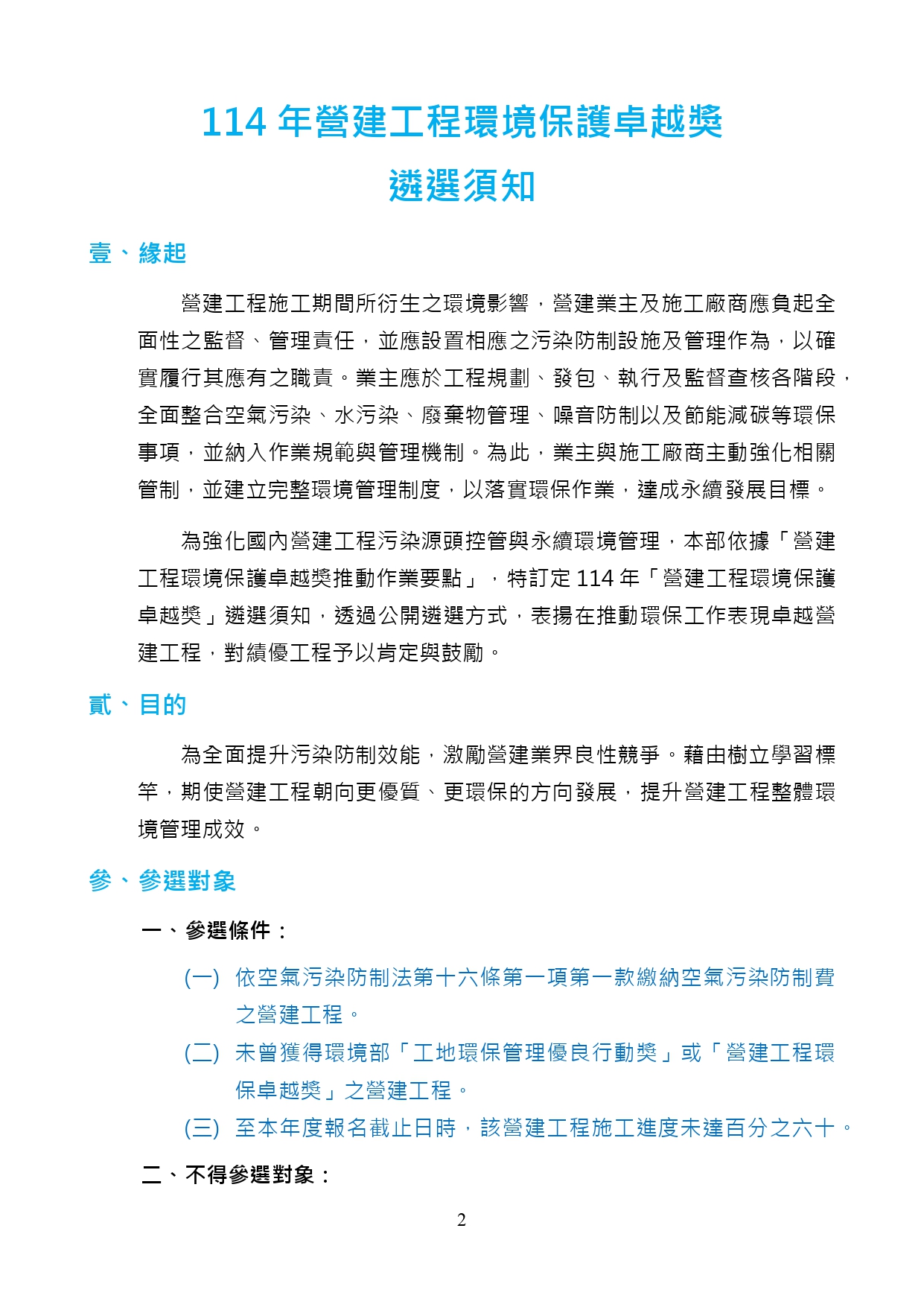 環境部 檢送「114年營建工程環境保護卓越獎遴選須知」,請踴躍推薦轄內優良營建工程報名參加(報名期間自即日起至9月30日止) 2025-09-16 檔案下載 環境部 114.9.11 環部空字第1141058608號函 檢送「114年營建工程環境保護卓越獎遴選須知」,請踴躍推薦轄內優良營建工程報名參加(報名期間自即日起至9月30日止),請查收。 本案遴選須知及報名表已置於雲端硬碟:(https://reurl.cc/YY6V2n)