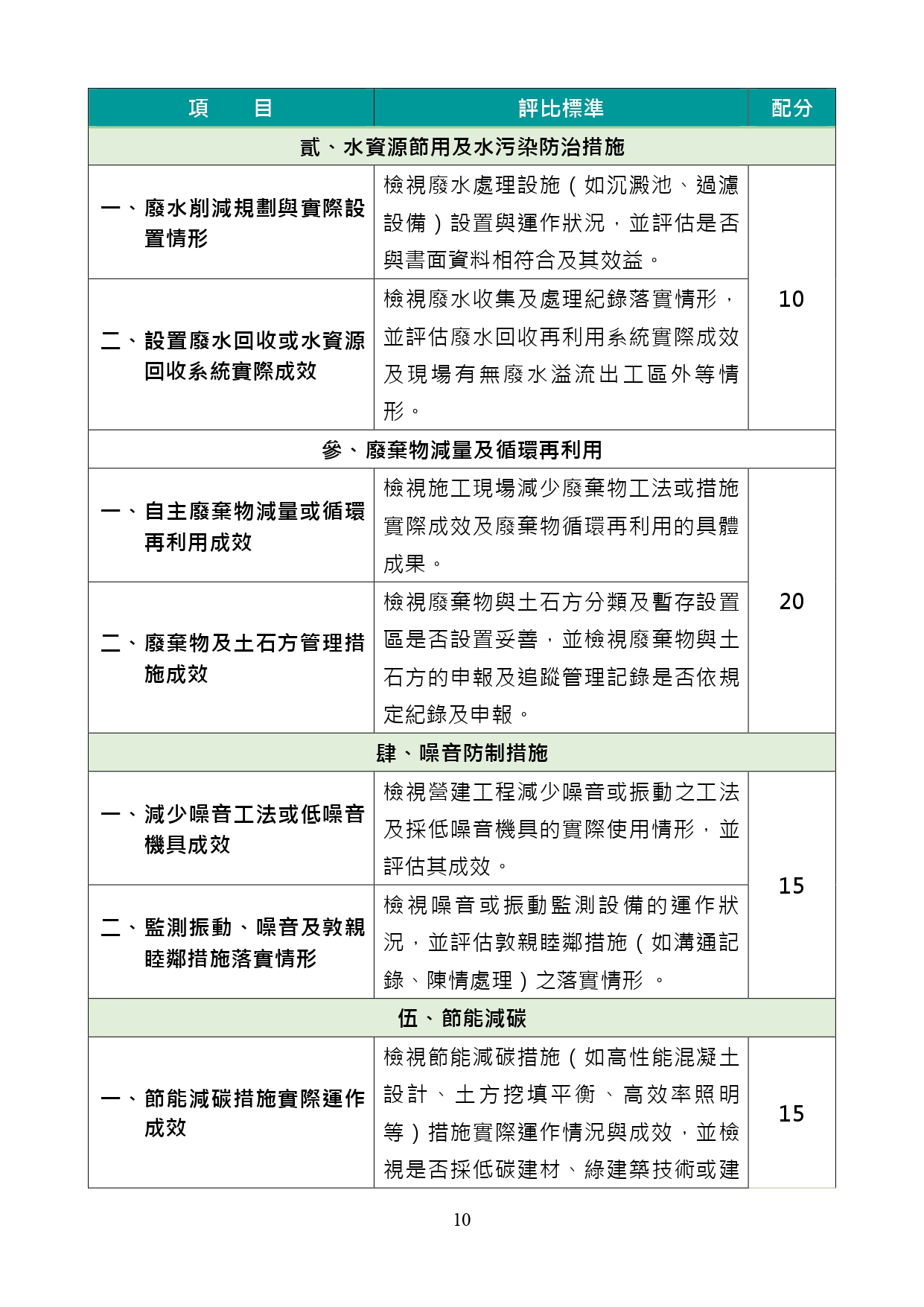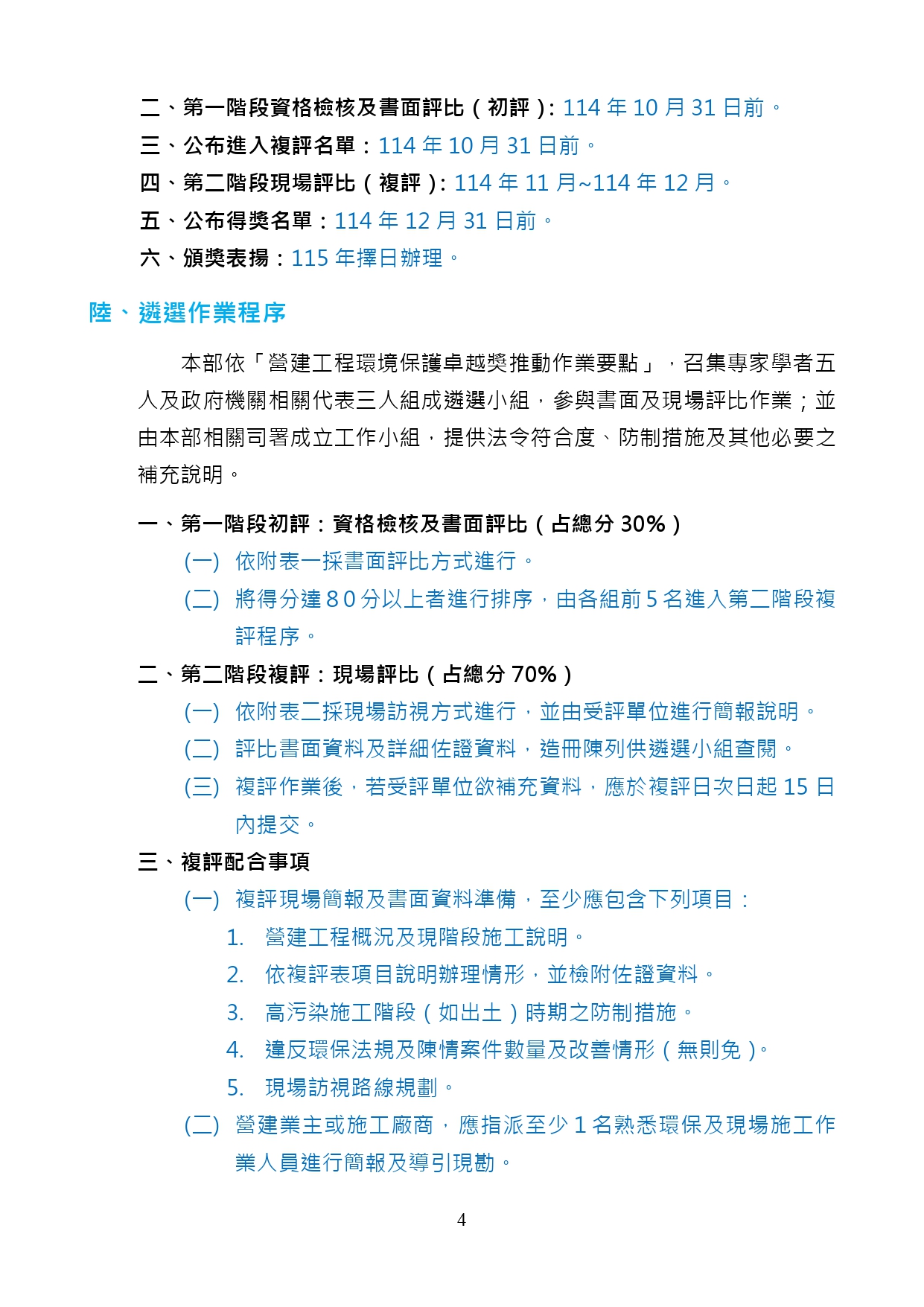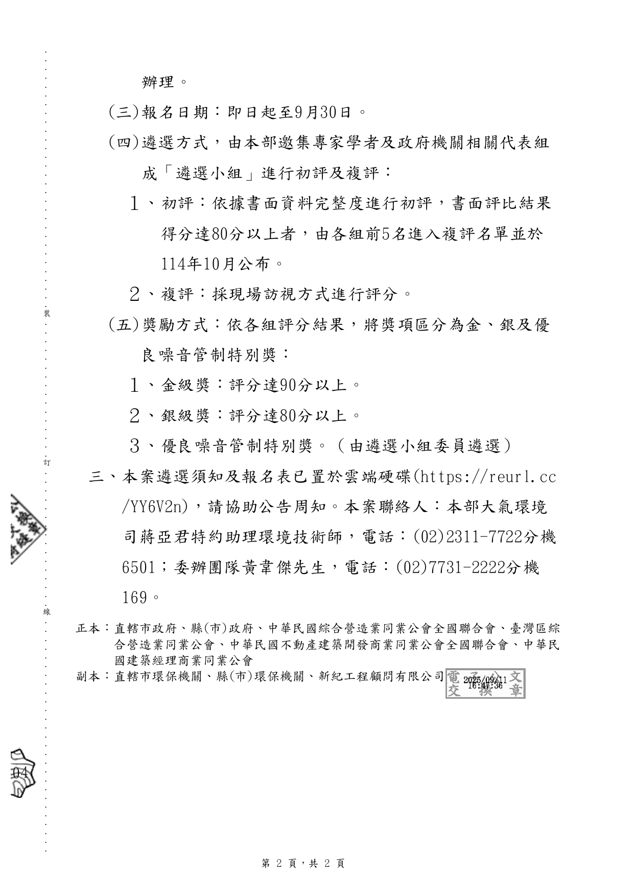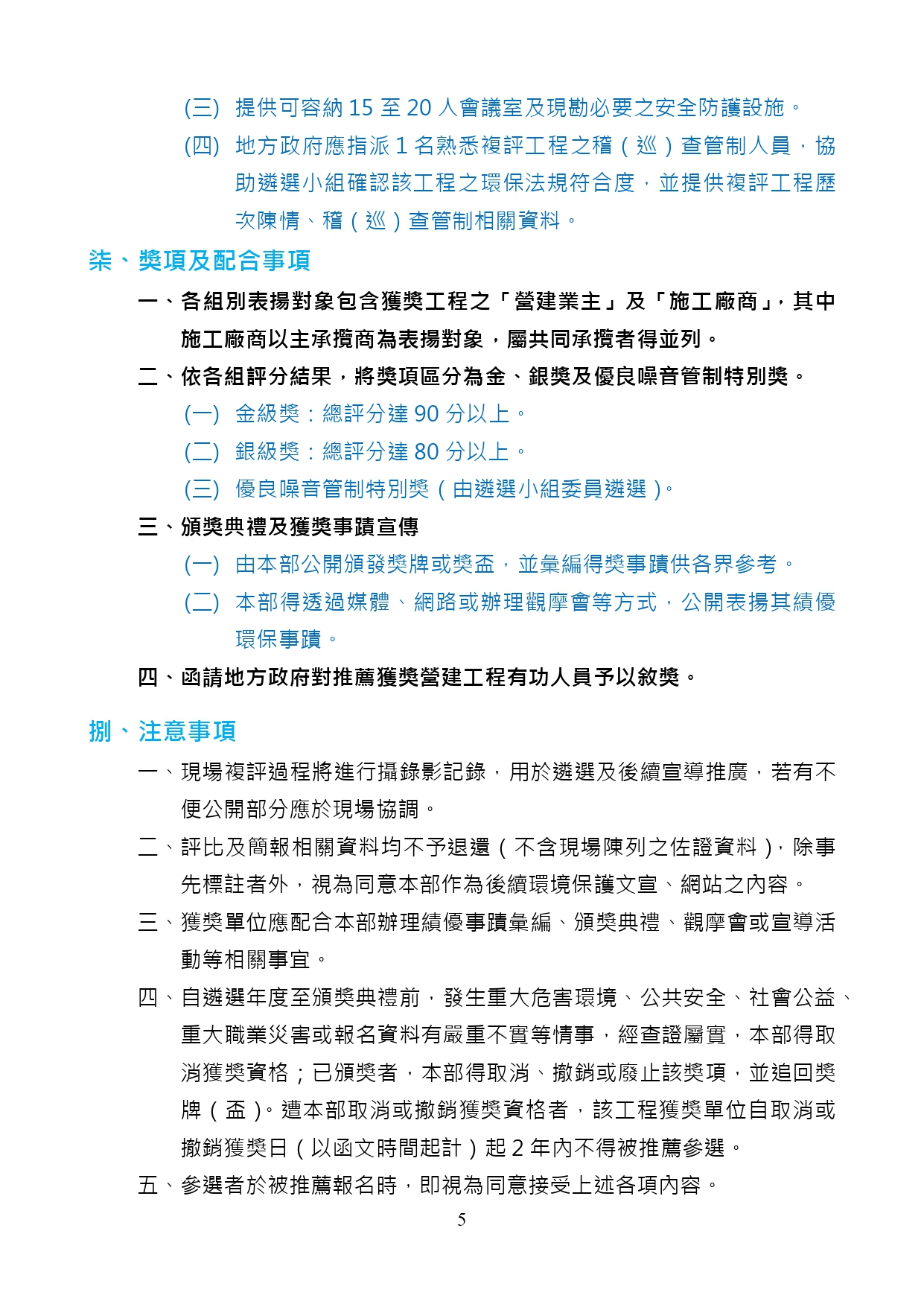 環境部 檢送「114年營建工程環境保護卓越獎遴選須知」,請踴躍推薦轄內優良營建工程報名參加(報名期間自即日起至9月30日止) 2025-09-16 檔案下載 環境部 114.9.11 環部空字第1141058608號函 檢送「114年營建工程環境保護卓越獎遴選須知」,請踴躍推薦轄內優良營建工程報名參加(報名期間自即日起至9月30日止),請查收。 本案遴選須知及報名表已置於雲端硬碟:(https://reurl.cc/YY6V2n)